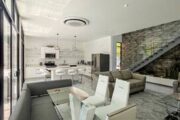 Guests enter the second floor of the property via the front door. Here you will find the main living room, dining area, and kitchen. The living space opens up to a balcony patio with stairs that lead down to the pool area.